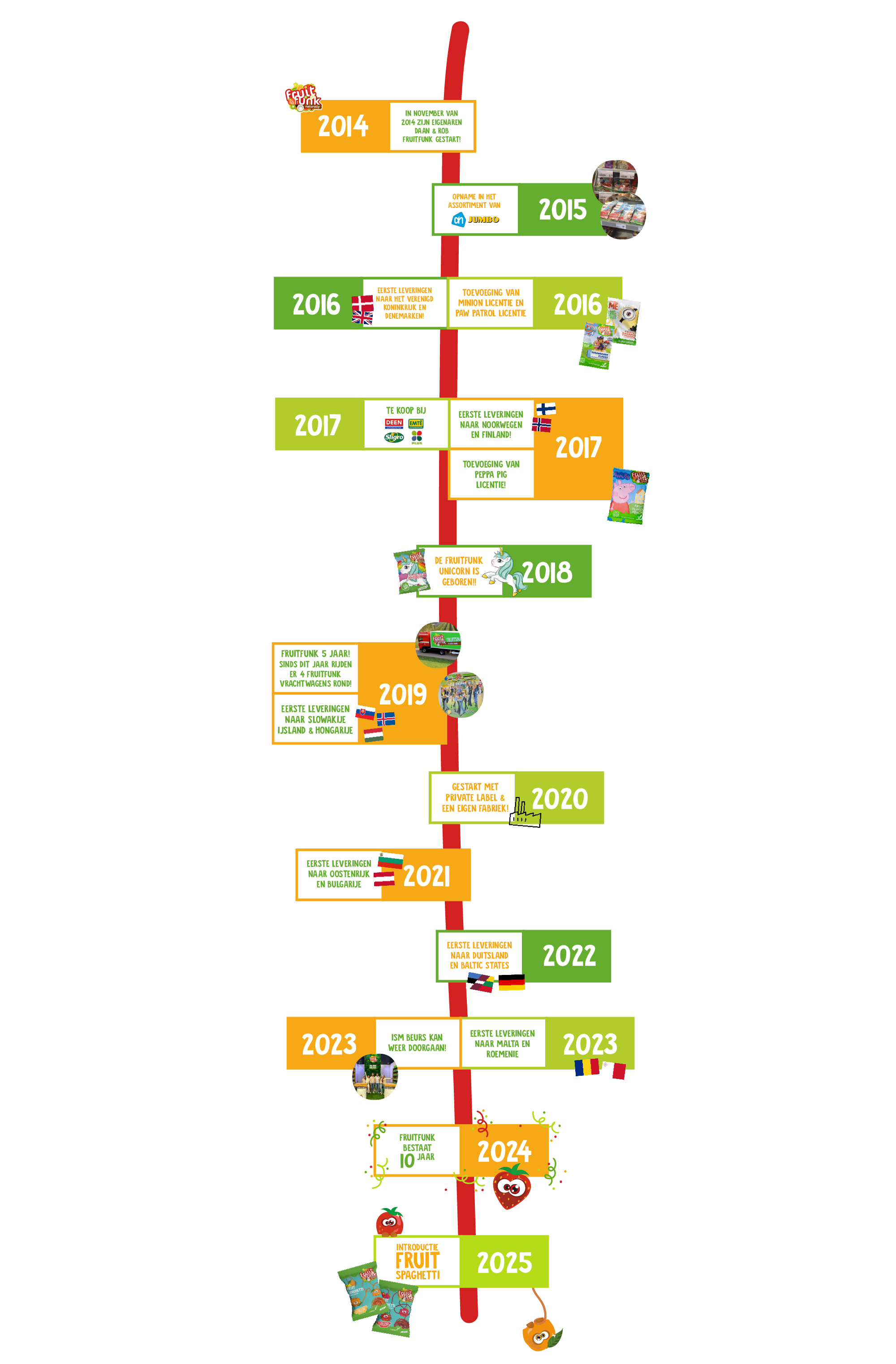 Wij, Rob en Daan, zagen dat er steeds meer behoefte was - en is - naar een verantwoord alternatief voor snoep en snacks voor kids. En daarom bedachten wij Fruitfunk. Met Fruitfunk is het mogelijk om kids te laten genieten van snoepjes en snacks op een verantwoorde manier! Onze producten zijn namelijk net zo lekker en leuk als het traditionele snoep, maar dan een stuk verantwoorder.